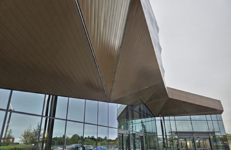 Crosstown Place is defined by its bold use of cross-pattern geometry, expressed across both the interior and exterior architecture. At the main entrance, the AL13 Plank System in Lexus Bronze is installed in the soffit using a cut-to-fit, on-site installation technique, allowing the planks to follow the building’s multi-directional, cross-angled forms with precision.